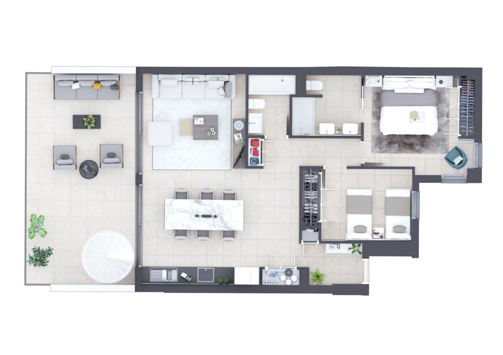 Viviendas de 2 y 3 dormitorios distribuidas en tres edificios de tres plantas y varias tipologías: apartamentos con jardín, apartamentos con amplias terrazas y áticos con solárium.